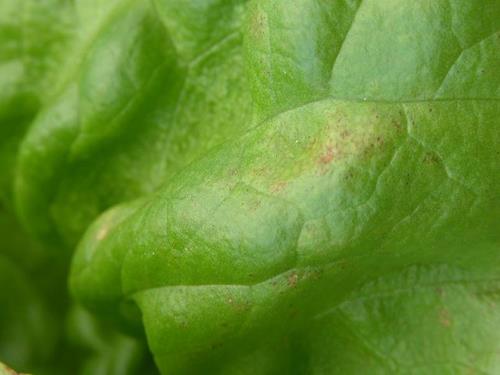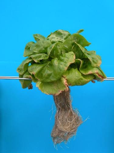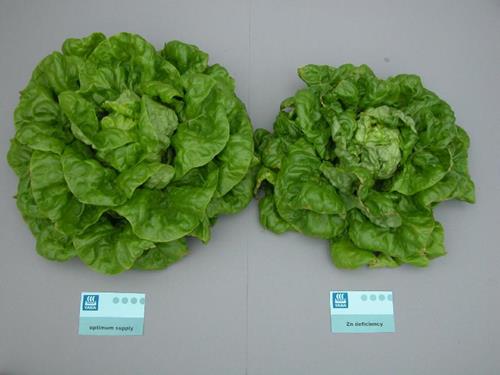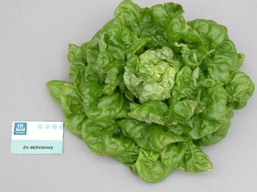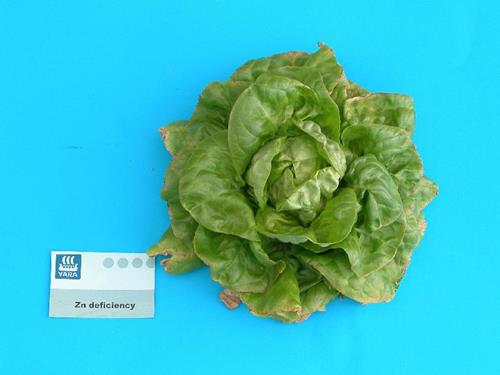 Symptoms of zinc deficiency on lettuce start on older or medium leaves. They develop papery, grey-green necrosic spots with brown borders on leaf margins. Necrotic areas increase quickly and flow together.