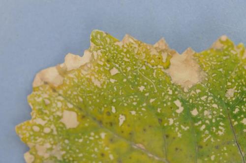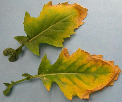 Starting from the marginal area, the leaves become chlorotic and subsequently show necrotic spots and patches. The necrotic tissue can show a pale, light brown colour, similar to sun burn damage.