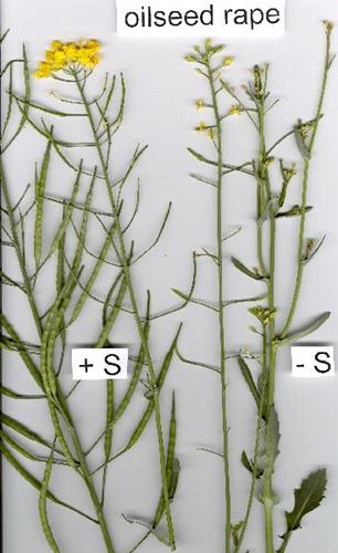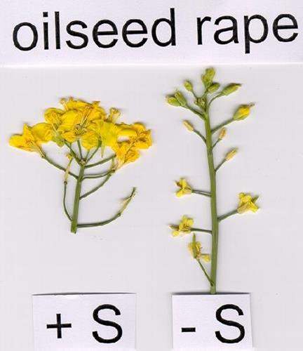 Flowering of the S deficient rape plants is inhibited. The flowers are deformed and the complete inflorescence shows a pale yellow to white color.
