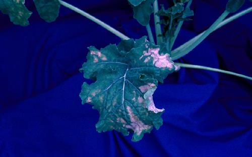 In their intercostal area, leaves show chloroses with white to pink necrotic patches. A narrow margin along the leaf veins remains green.