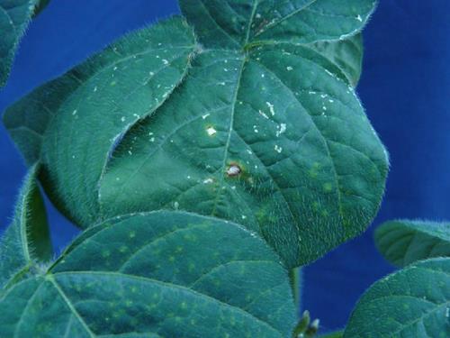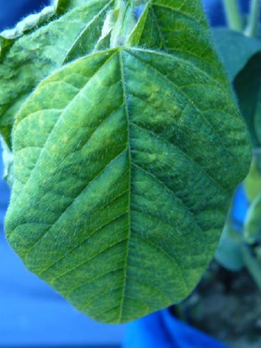 Upper leaves turn yellow and become mottled with small, brown necrotic spots.
