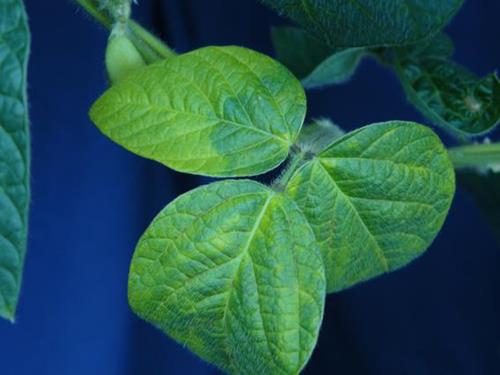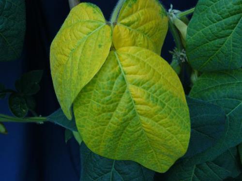 Several leaves, different in age, show a light green to yellow chlorosis, spreading irregularly over the leaf blade.