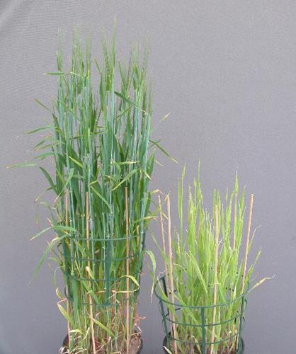 The whole plant including the ears shows stunted growth and yields poorly.